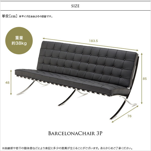 【商品について】三人掛けチェア【バルセロナチェア】(デザイナーズ)■サイズ:外寸:(約)幅183.5x奥行き76x高さ85cm(座面高さ44cm)※商品重量:(約)38kg■カラー:ブラック ホワイト■素材:PU(柔らかい合成皮革) PVC(合成皮革) ステンレススチールパイプ■その他:・完成品でのお届けです。
