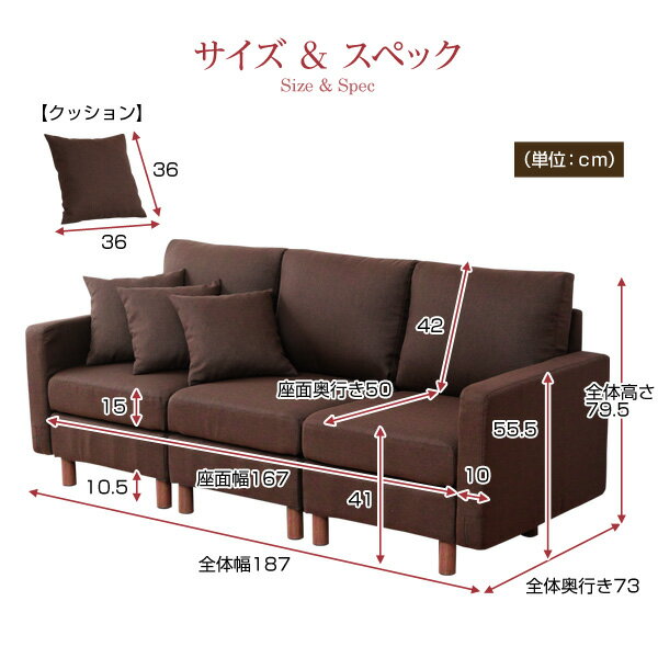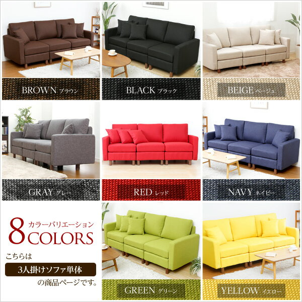【商品について】※こちらのページは【3人掛けタイプ】のページです※■サイズ:ソファ本体外寸:(約)幅187x奥行き73x高さ79.5cm■カラー:ブラウン ベージュ ネイビー グリーン グレー レッド イエロー ブラック■素材:ウレタンフォーム、コイルスプリング、鉄 ■その他:・お客様組立商品です※お客様で肘掛け・背もたれ・座面などを組み合わせて頂く商品です。